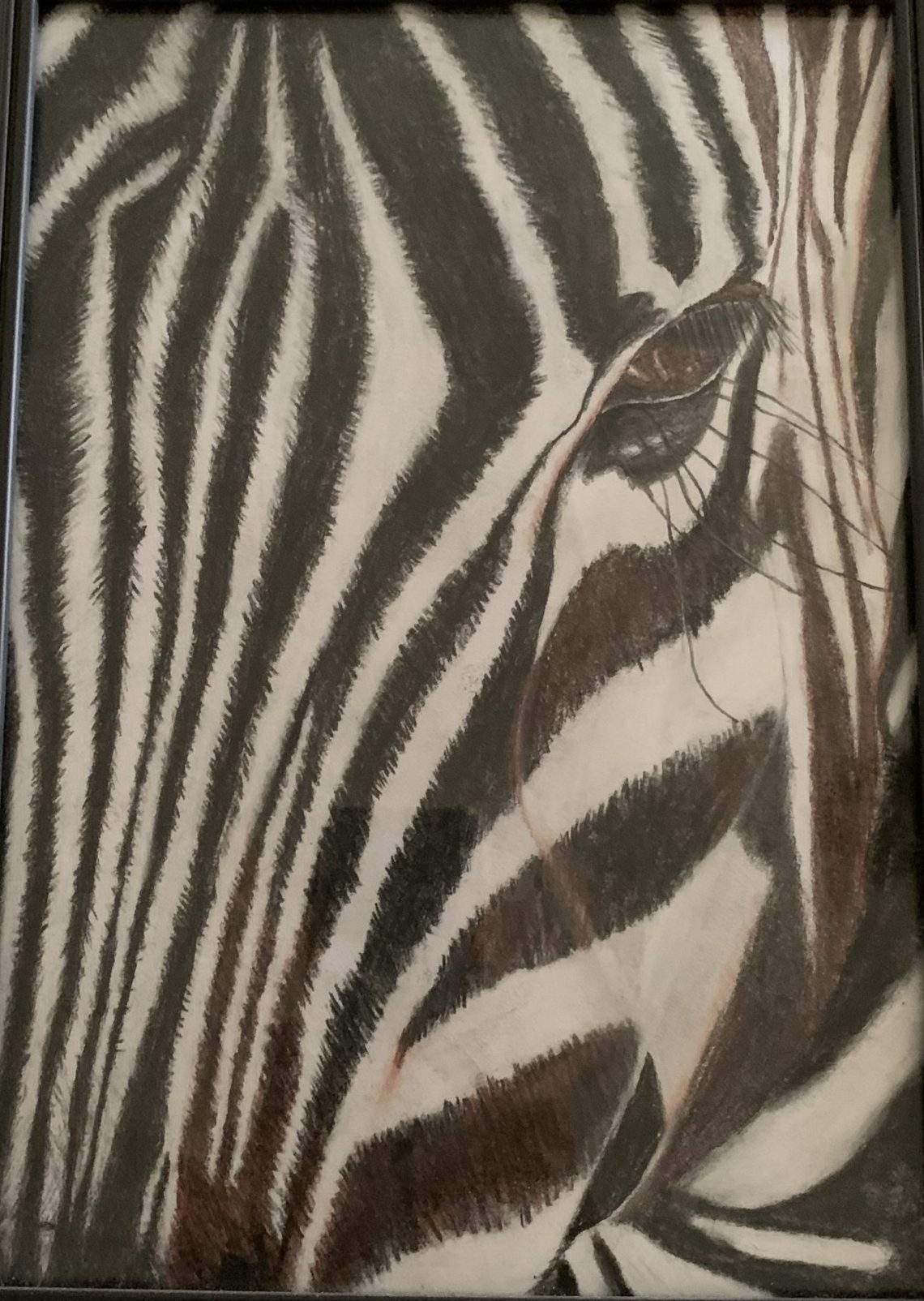 This Zebra moved around with me partially completed through at least three house moves. The best part is that it is an A4 size, so it is easy to look after and keep in a sleeve. I kept it together with all the original pencils I used to create it. It consists of charcoal, chalk and pastel pencil. I eventually completed it in the middle of 2019 by which time it was about 5 years old and even now it remains behind glass in my personal collection.