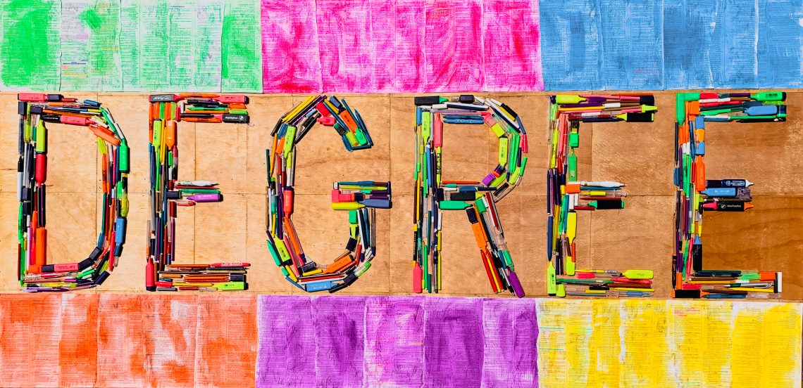 Although I am an artist, before I was able to fully realize my artist side I first followed the “safe” route. I qualified as an accountant. This involves a significant amount of dedication and studying. As a rough estimate I think 5 years, during this time I kept a box of all my dried out and ran out pens and highlighters. It was actually quite a lot over that period time. I took all these old dried out and useless pieces of plastic and converted them into lettering on this piece. The “DEGREE” section consists solely of all these pens and highlighters. The colorful outline above and below the letters…